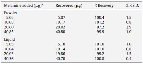 Độ chính xác của phương pháp này được đánh giá ở nồng độ bốn mức độ melamine (5, 10, 20 và 40 µgmL-1) với việc sử dụng 1 g khô hoặc10ml mẫu chất lỏng. Hiệu suất thu hồi phản ánh một trung bình cộng của sáu lần phân tích tại mỗi nồng độ và được báo cáo trong bảng 1.