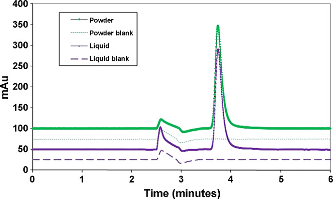 Một nghiên cứu chính xác cũng đã được tiến hành ở mức LOQ bằng việc tiêm sáu lần riêng rẽ chất pha chế và giá trị % RSD của diện tích peak được tính toán. Một nghiên cứu về hiệu suất thu hồi được thực hiện trong ba lần, mức LOD và LOQ cho mẫu bột và chất lỏng cho thấy hiệu suất trung bình là 75 ± 2% của LOD và 90 ± 1% của LOQ