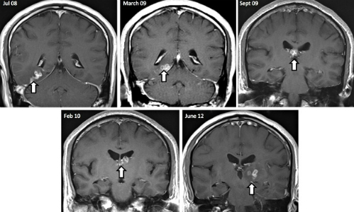 thấy sự di chuyển của con sán trong đầu bệnh nhân qua thời gian (mũi tên).
