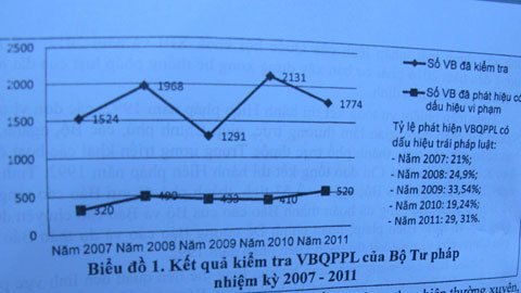 Theo ông Liên, hơn 1.000 văn bản trong số này có nội dung trái pháp luật. Một số đã được chính các cơ quan đơn vị xử lý. Tỉ lệ phát hiện các văn bản có dấu hiệu trái pháp luật những năm gần đây không giảm: năm 2007: 21%, 2008 24,9%, 2009 33,54%, 2010 19,24%, 2011 là 29,31%.