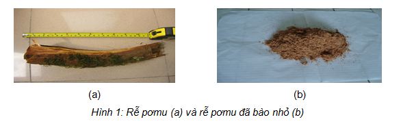 Nguyên liệu nghiên cứu là thân và rễ cây pơmu được lấy ở xã Ladê, huyện Nam Giang, tỉnh Quảng Nam. Rễ và thân pơmu được làm sạch, bào mỏng, xay nhỏ bằng máy bào và máy xay (hình 1). Việc xay nhỏ nguyên liệu sẽ giúp cho quá trình chưng cất diễn ra nhanh và đạt hiệu suất cao hơn.